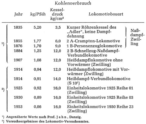Den größten Sprung finden wir natürlich von dem noch ohne Dampfdehnung, also äußerst unwirtschaftlich arbeitenden ”Adler” zur 2 A-Crampton-Lokomotive mit Expansionssteuerung. Zwei weitere große Schritte führen über die Naßdampf-Verbund- zur Heißdampflokomotive. Danach wird die Verbrauchssenkung erheblich flacher, aber auch heute sind noch nicht alle Entwicklungsmöglichkeiten der Dampflokomotive ausgeschöpft.