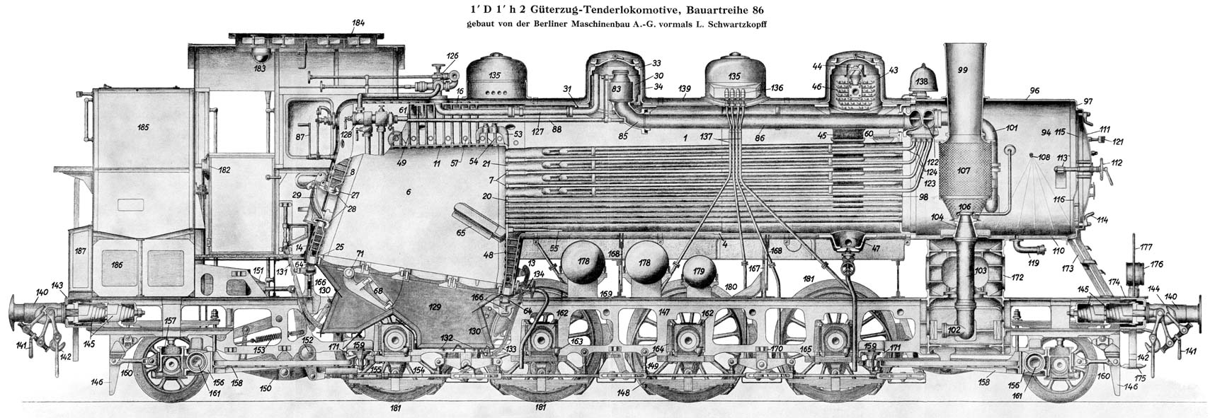 146 Bahnräumer 147 Barrenrahmenwange 148 Tragfeder 149 Federspannschraube 150 Laengsausgleichhebel 151 Bremszylinder 152 Bremswelle mit Bremshebeln 153 Rückzugfeder im Bremsgestänge 154 Bremszugstange 155 Spannschloß 156 Lenkgestell mit Laufradsatz 157 Achslagergehäuse zum Lenkgestell 158 Deichsel 159 Drehzapfen 160 Pendelstangen 161 Rückstelleinrichtung 162 Achslagergehäuse 163 Öltrichter 164 Achslagerstellkeil 165 Achslagersteg 166 Stehkesselträger 167 Senkrechte Rahmenverbindung 168 Kesselpendelblech 169 Waagerechte Rahmenverbindung 170 Rahmenstrebe 171 Rahmenverbindung für Drehzapfenlager 172 Rahmenverbindung zwischen den Zylindern 173 Rauchkammerstrebe 174 Vorderer Pufferträger 175 Tritt am Pufferträger 176 Signallaternen 177 Griff auf den Pufferträgern 178 Hauptluftbehälter 179 Hilfsluftbehälter 180 Treibradsatz 181 Kuppelradsatz 182 Wurfhebel-Handbremse 183 Führerhausdeckenleuchte 184 Entlüftungsklappen 185 Kohlenkasten 186 Wasserkasten 187 Werkzeugschrank |